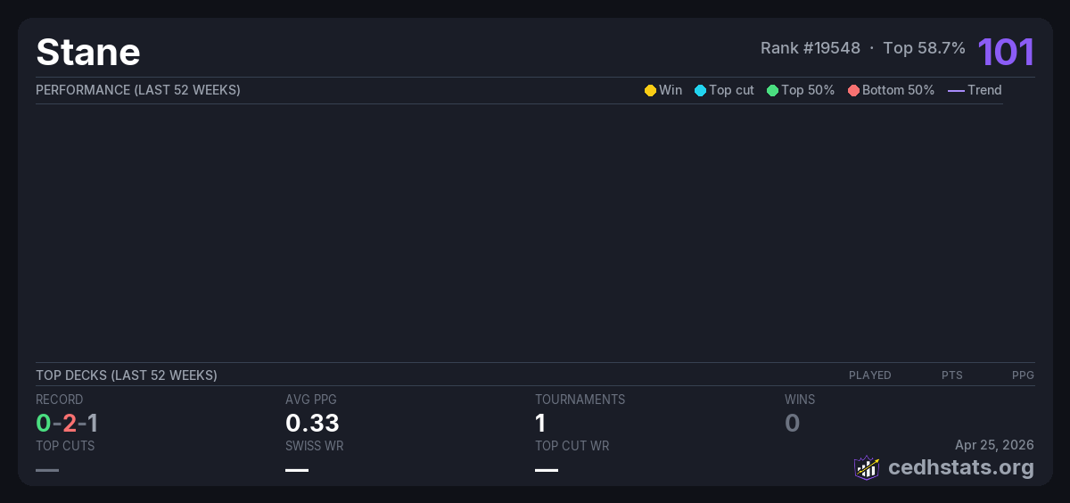 | Commander League 3 week 2 Feb 07, 2026 · 20 players | 8/20 | 0-2-1 | 0.33 | 101 |
