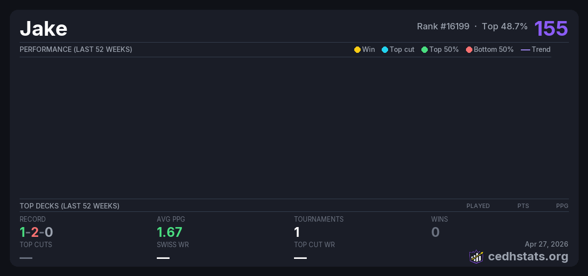 | Jake's B'Day CEDH Jan 24, 2026 · 16 players | 5/16 | 1-2-0 | 1.67 | 155 |