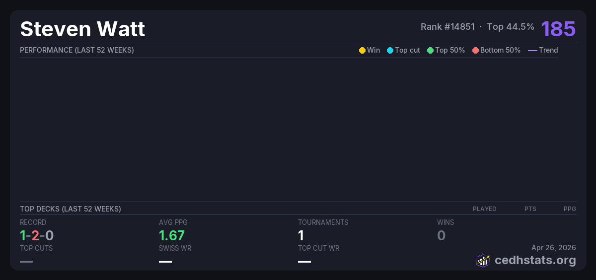 | W28V2EN - March 22 Commander Mar 22, 2026 · 21 players | 5/21 | 1-2-0 | 1.67 | 185 |