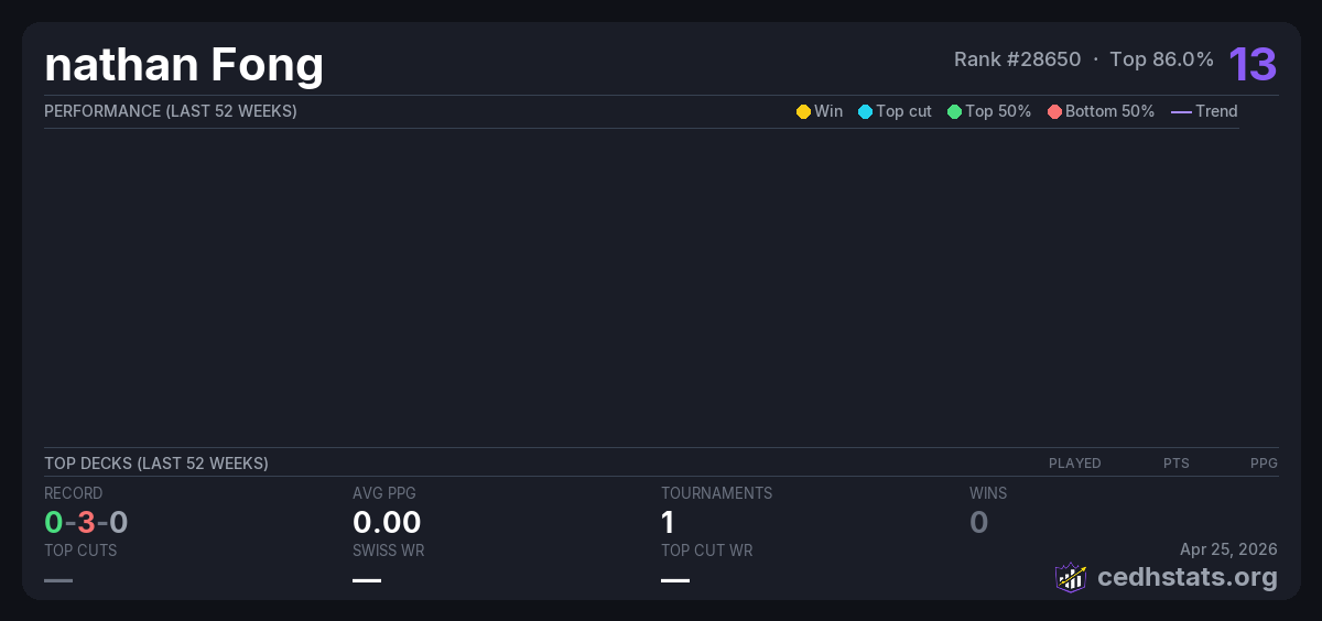 | friday mtg Mar 21, 2026 · 29 players | 24/29 | 0-3-0 | 0.00 | 13 |
