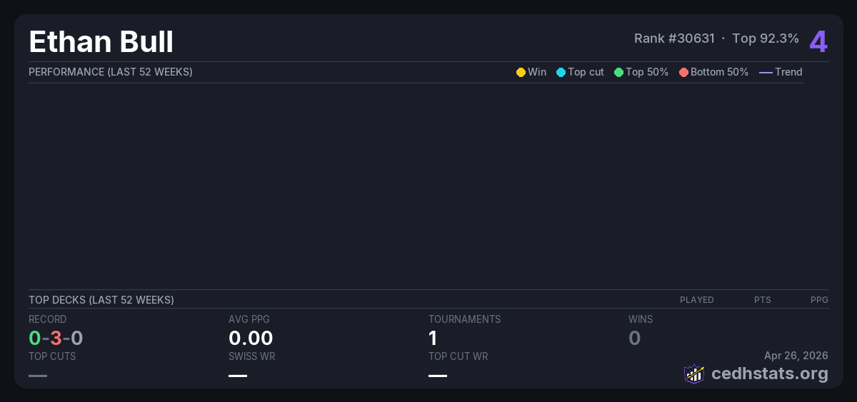 | Bracket 3 Mar 08, 2026 · 26 players | 24/26 | 0-3-0 | 0.00 | 4 |