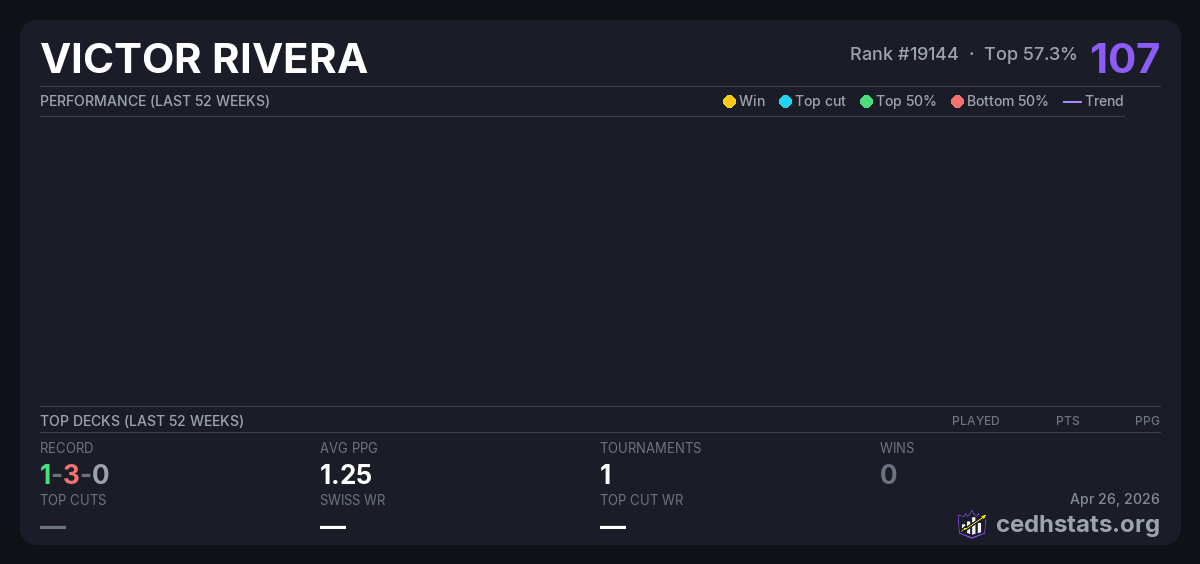 | EDH BRACKET 3 Aug 30, 2025 · 21 players | Invalid pairing | 9/21 | 1-3-0 | 1.25 | 107 |