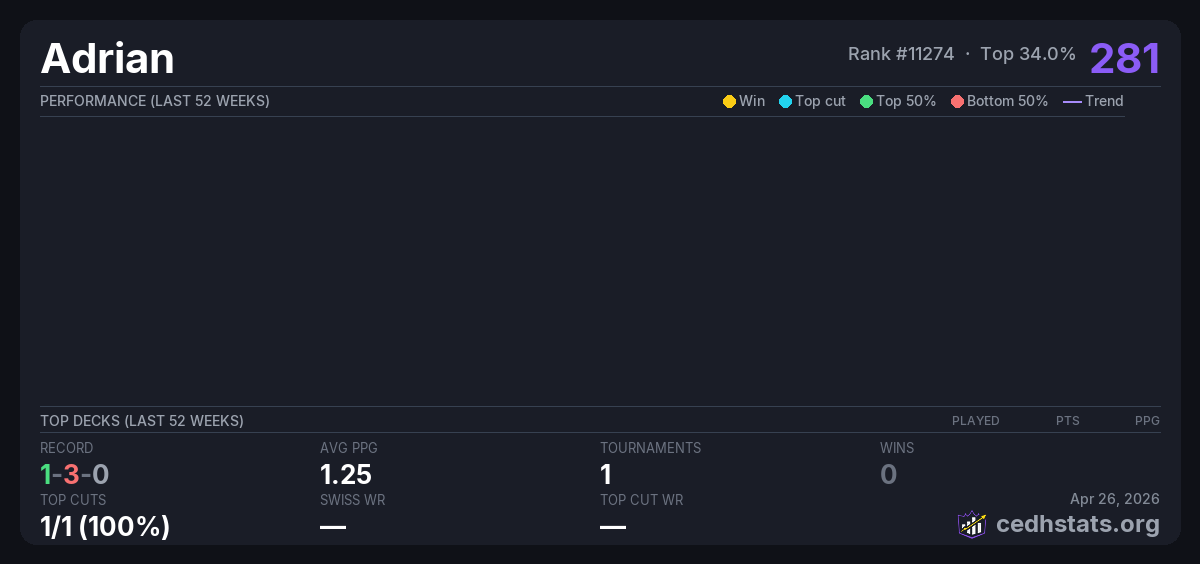 | Storm Champs July Jul 26, 2025 · 16 players | Invalid pairing | 2/16 | 1-3-0 | 1.25 | 281 |