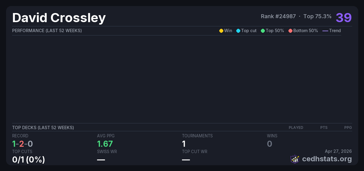 | Weekly Monday cEDH Jul 14, 2025 · 18 players | Invalid pairing | 12/18 | 1-2-0 | 1.67 | 39 |