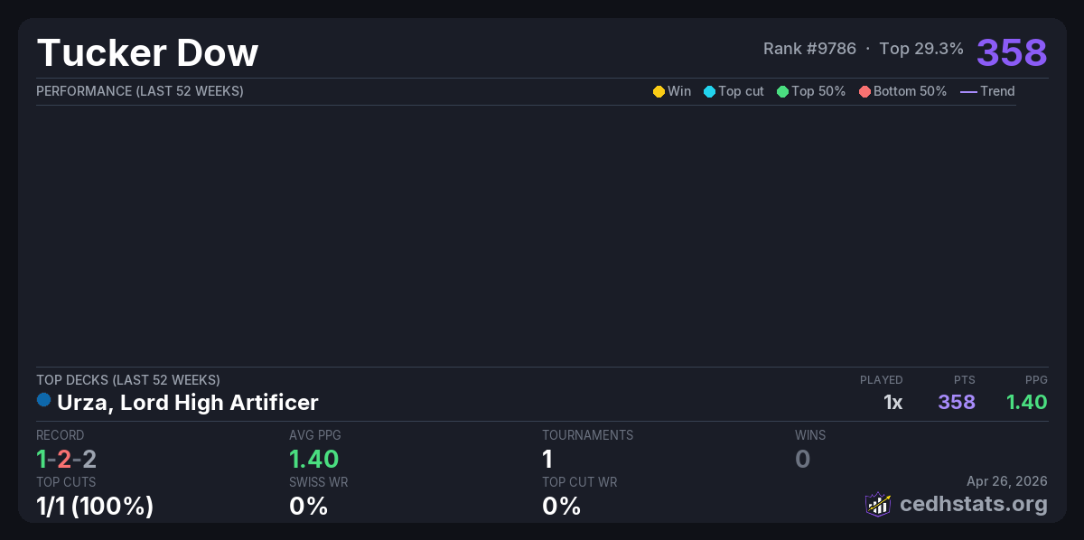 | Game On Win-A-Vault Cedh April 25th Apr 25, 2026 · 43 players | Urza, Lord High Artificer | 11/43 | 1-2-2 | 1.40 | 358 |