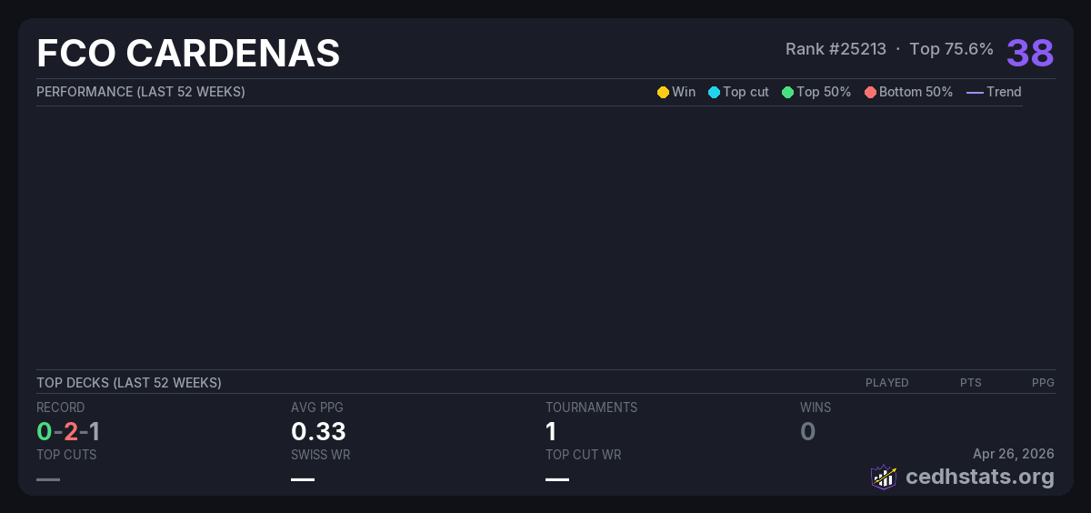 | cedh Jul 10, 2025 · 20 players | Invalid pairing | 13/20 | 0-2-1 | 0.33 | 38 |