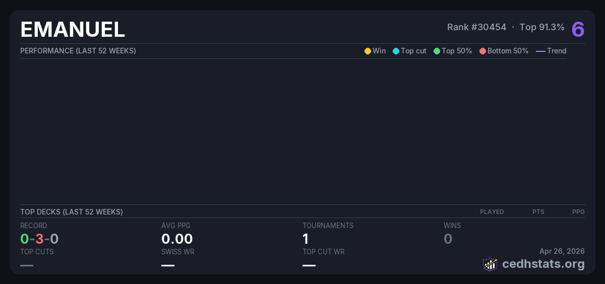 | CEDHI May 08, 2025 · 20 players | Invalid pairing | 18/20 | 0-3-0 | 0.00 | 6 |