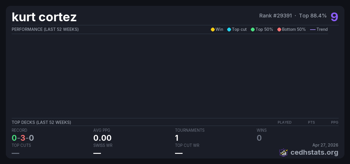 | FNM Commander @ Game On! NC Jul 11, 2025 | Invalid pairing | 36/42 | 0-3-0 | 9 |