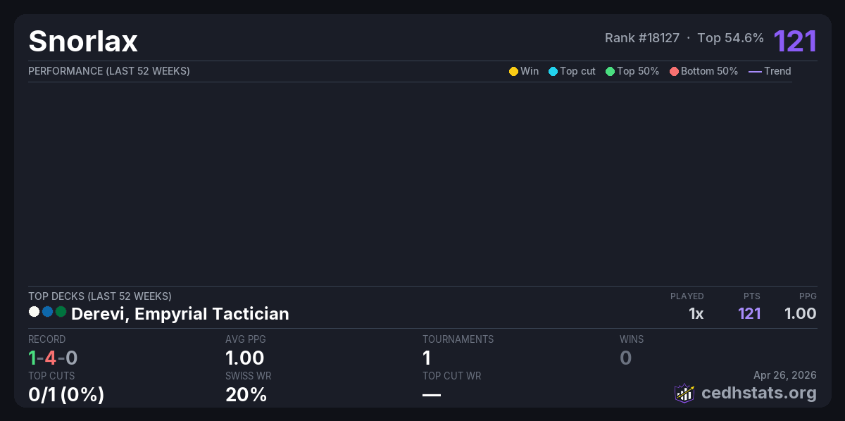 | Ascendancy: A CEDH Tournament Apr 26, 2026 · 40 players | Derevi, Empyrial Tactician | 21/40 | 1-4-0 | 1.00 | 121 |