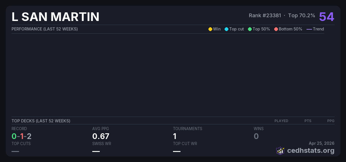 | CUDH Sep 25, 2025 · 24 players | Invalid pairing | 14/24 | 0-1-2 | 0.67 | 54 |