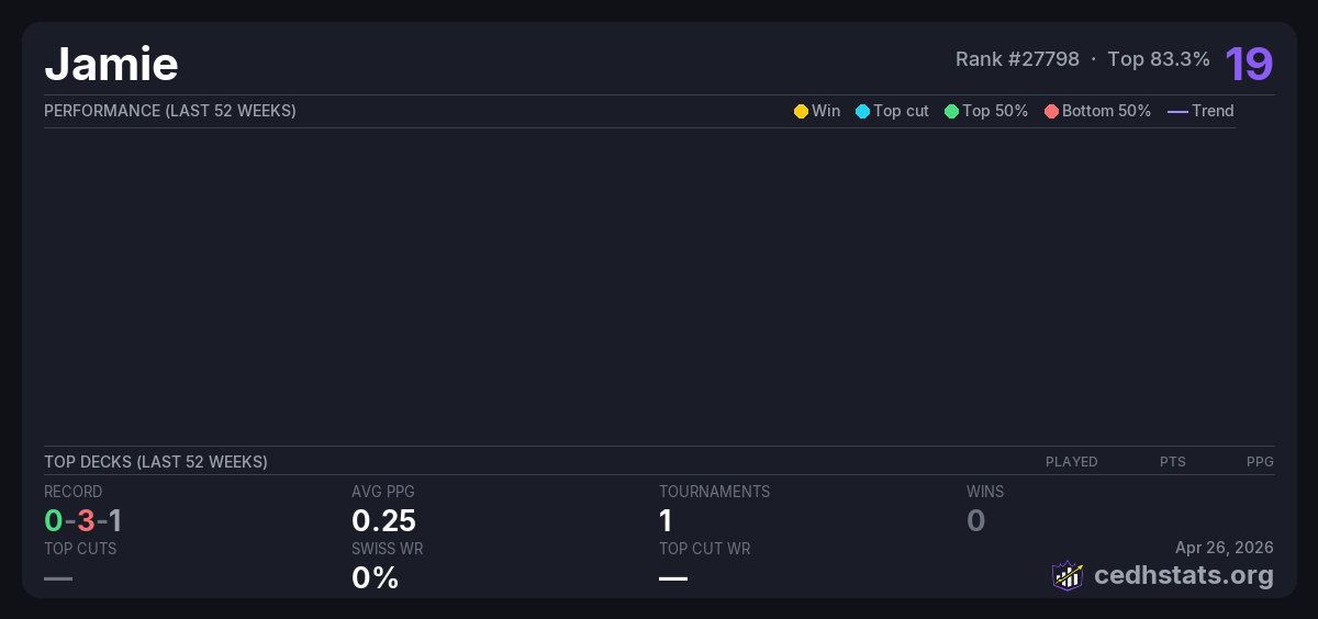 | A-State Magic: The Gathering Club Tournament Apr 25, 2026 · 16 players | — | 12/16 | 0-3-1 | 0.25 | 19 |