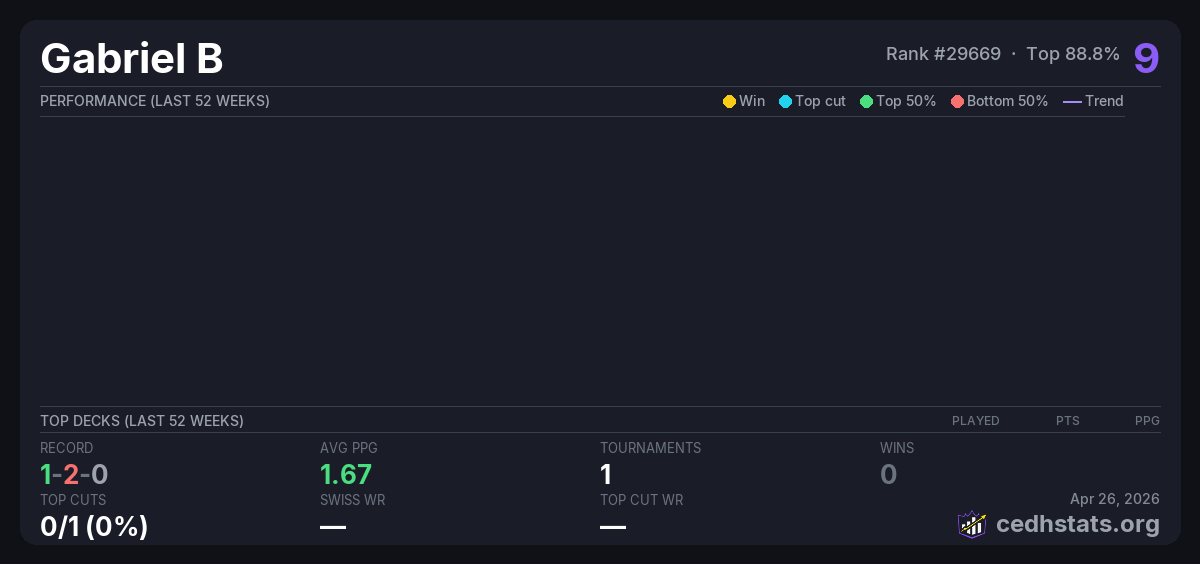 | The Iron Lion March CEDH League Mar 04, 2026 · 16 players | — | 14/16 | 1-2-0 | 1.67 | 9 |