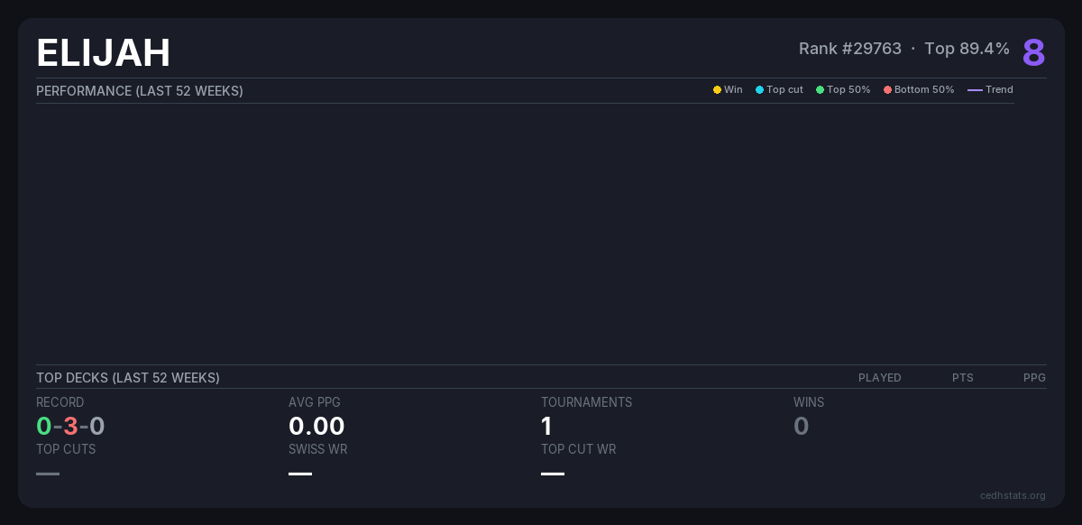 | Friday Night Commander Apr 11, 2026 · 17 players | 15/17 | 0-3-0 | 0.00 | 8 |