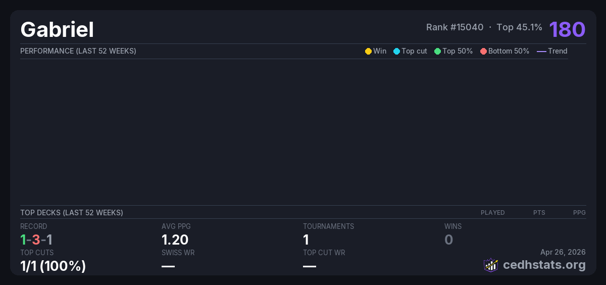| CEDH Dec 21, 2025 · 21 players | 7/21 | 1-3-1 | 1.20 | 180 |