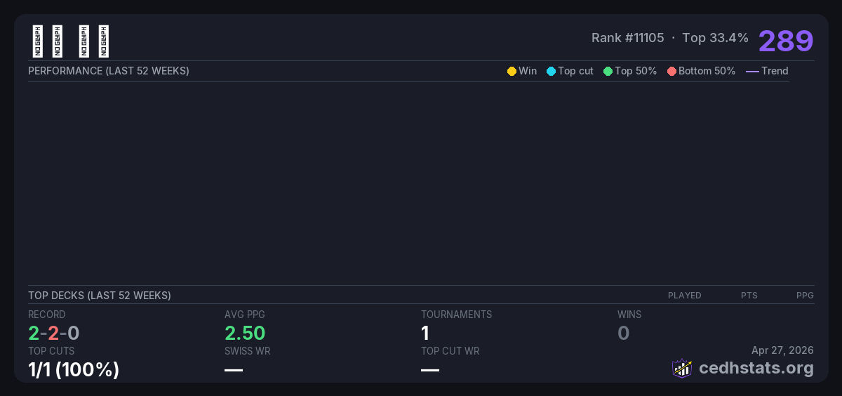 | 1月25日 CEDH月赛 Jan 25, 2026 · 28 players | 3/28 | 2-2-0 | 2.50 | 289 |
