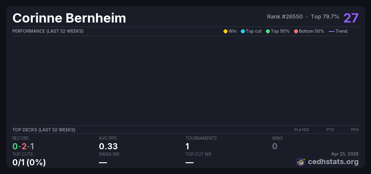 | Precon Night Sep 27, 2025 · 24 players | Invalid pairing | 17/24 | 0-2-1 | 0.33 | 27 |