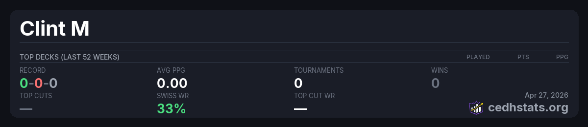 | Tournament | Deck | Result | Record | PPG | Points ? |