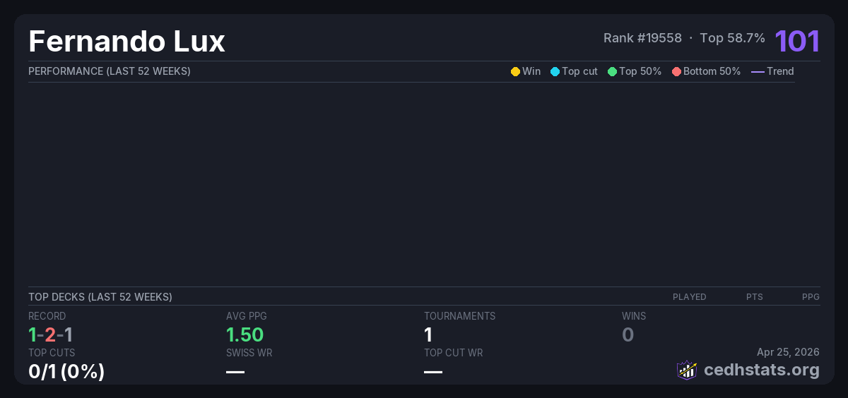 | 2.5k CEDH Tournament Quiche 2025 (Guatemala) (Copy) Aug 09, 2025 · 24 players | Invalid pairing | 10/24 | 1-2-1 | 1.50 | 101 |