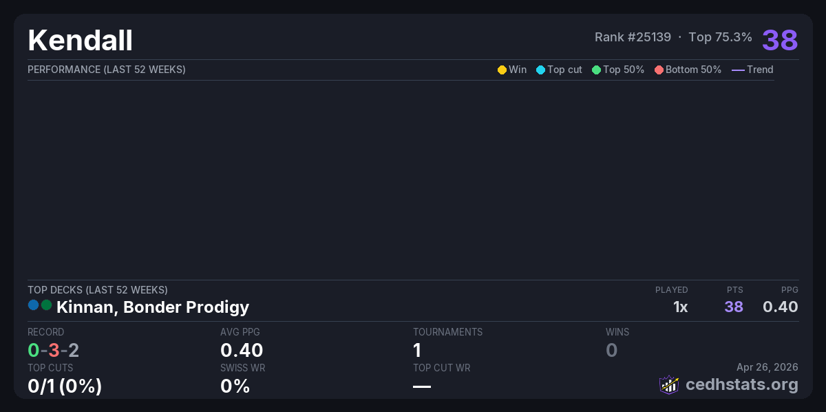 | 100% Dual Land CEDH Tournament Apr 25, 2026 · 32 players | Kinnan, Bonder Prodigy | 24/32 | 0-3-2 | 0.40 | 38 |