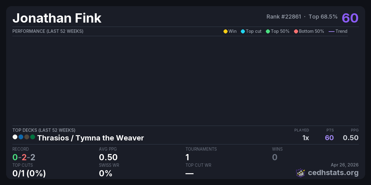 | Game On Win-A-Vault Cedh April 25th Apr 25, 2026 · 43 players | Thrasios / Tymna | 29/43 | 0-2-2 | 0.50 | 60 |