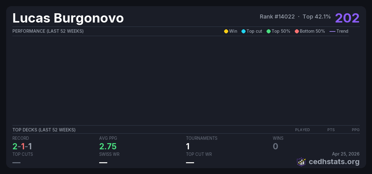 | Tournament | Deck | Result | Record | PPG | Points ? |