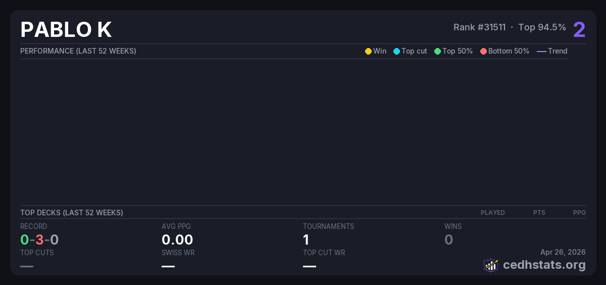 | CIDHACHE Jun 19, 2025 · 20 players | Invalid pairing | 19/20 | 0-3-0 | 0.00 | 2 |