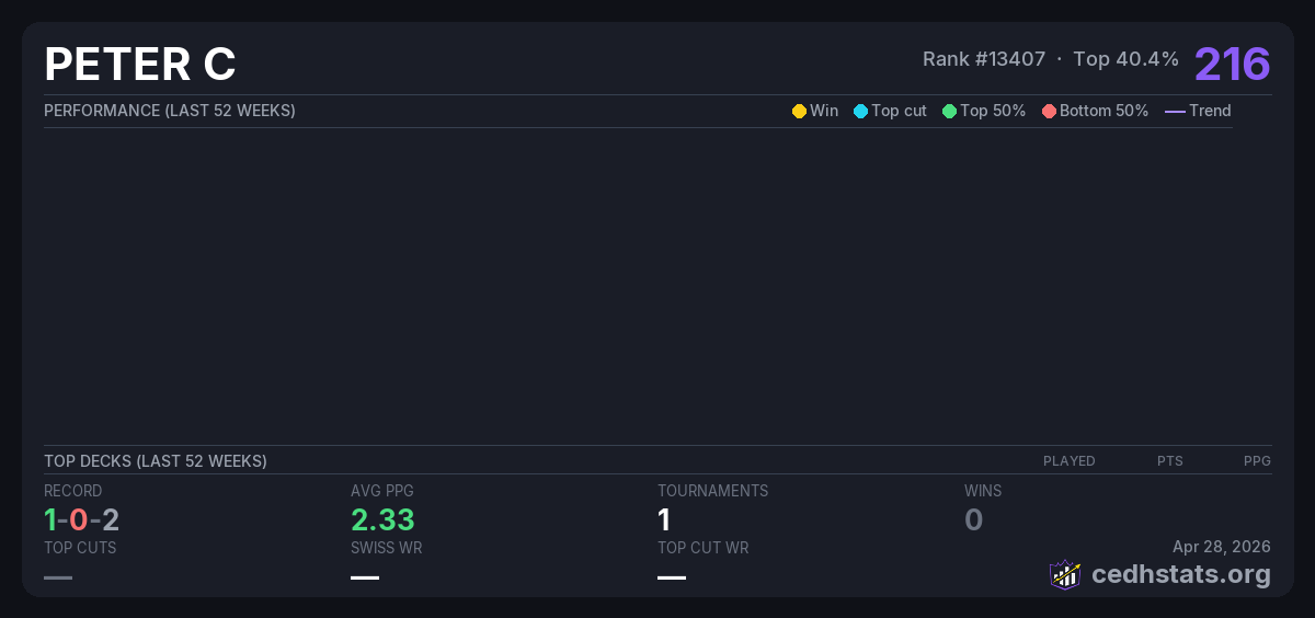 | CEDHHH Aug 07, 2025 · 20 players | Invalid pairing | 2/20 | 1-0-2 | 2.33 | 216 |