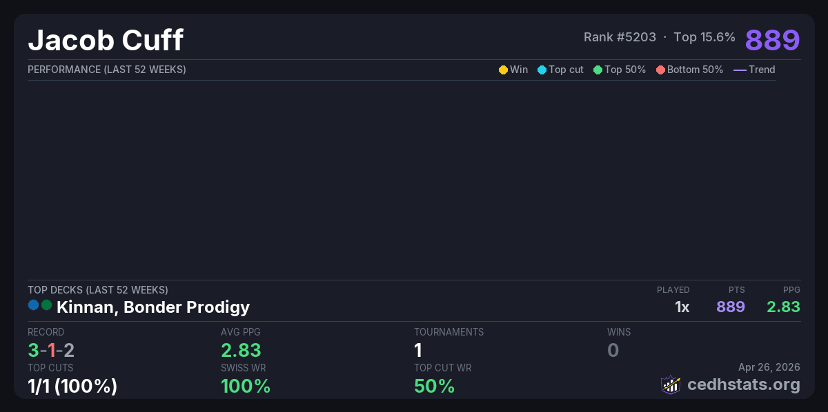 | Game On Win-A-Vault Cedh April 25th Apr 25, 2026 | Kinnan, Bonder Prodigy | 2/43 | 3-1-2 | 889 |