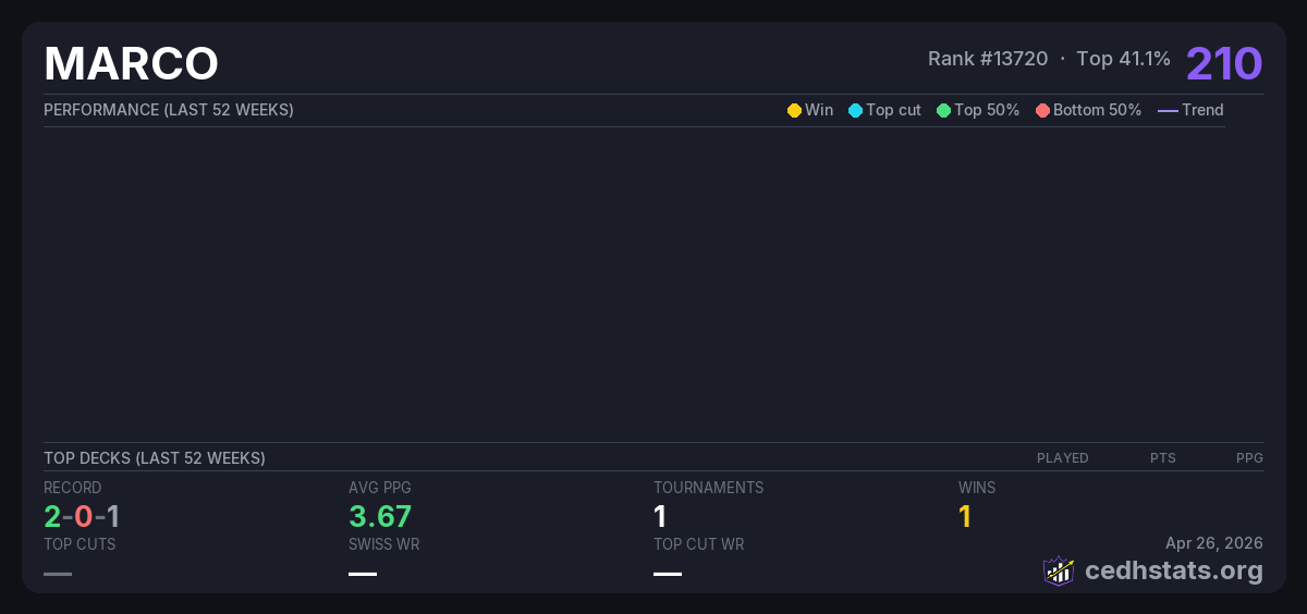 | Tournament | Deck | Result | Record | PPG | Points ? |