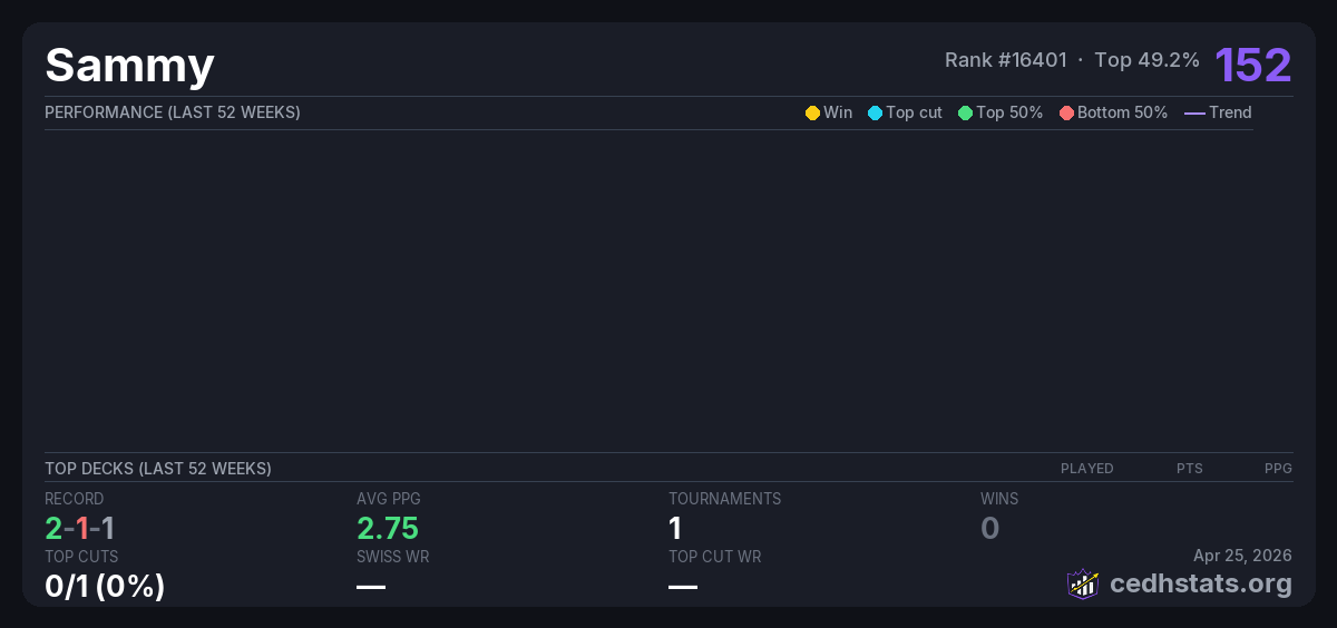 | Clash at the Cradle Nov 29, 2025 · 20 players | 5/20 | 2-1-1 | 2.75 | 152 |