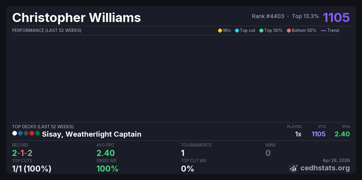 | SeaEDH 21 "The Reckoning" Apr 25, 2026 | Sisay, Weatherlight Captain | 2/52 | 2-1-2 | 1104 |