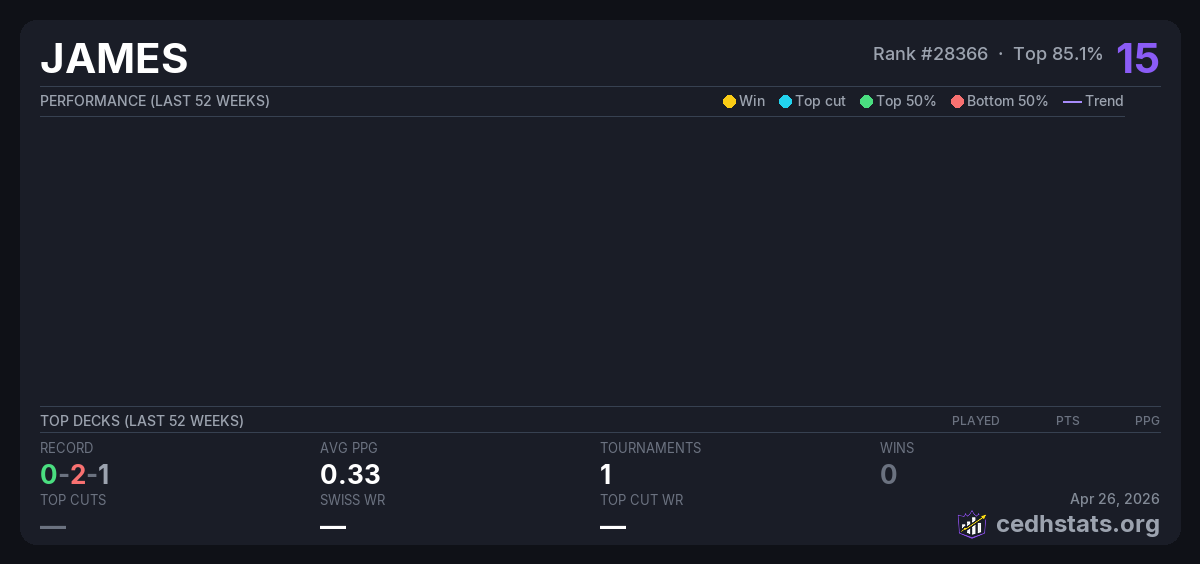 | CEDHH Aug 14, 2025 · 20 players | Invalid pairing | 16/20 | 0-2-1 | 0.33 | 15 |