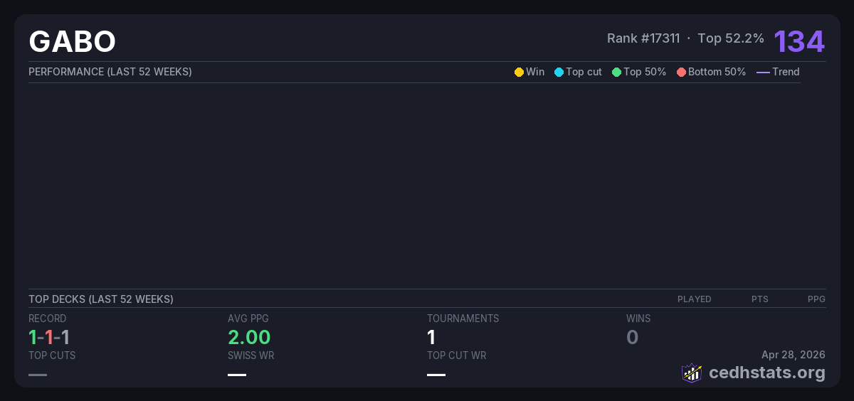 | cedhh May 01, 2025 · 20 players | Invalid pairing | 6/20 | 1-1-1 | 2.00 | 134 |