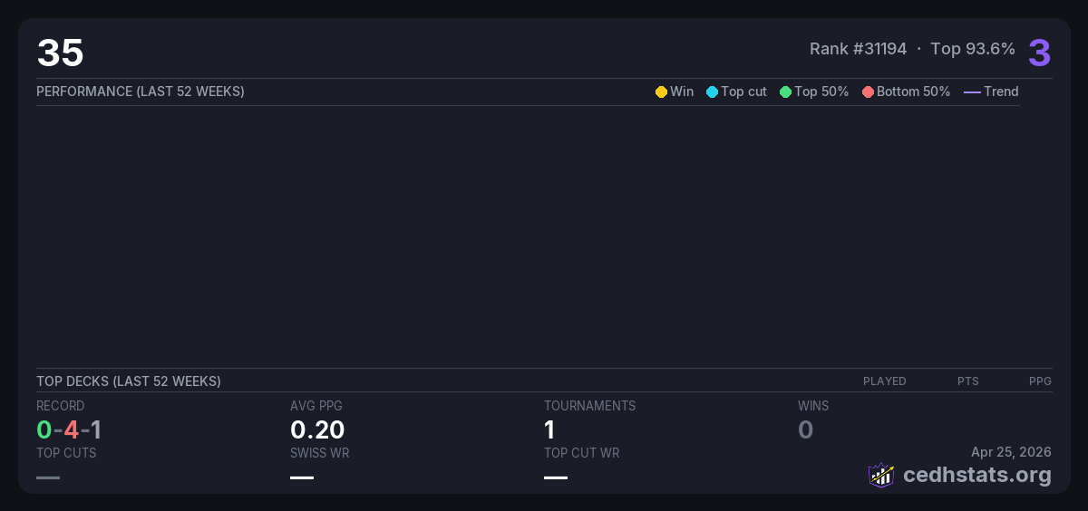 | PRUEBA Jul 09, 2025 · 64 players | Invalid pairing | 59/64 | 0-4-1 | 0.20 | 3 |