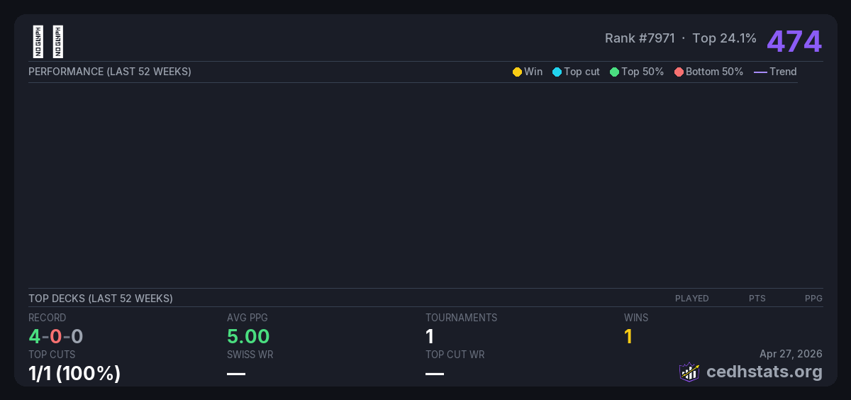 | 6月22日CEDH月赛 Jun 22, 2025 | Invalid pairing | 1/28 | 4-0-0 | 474 |