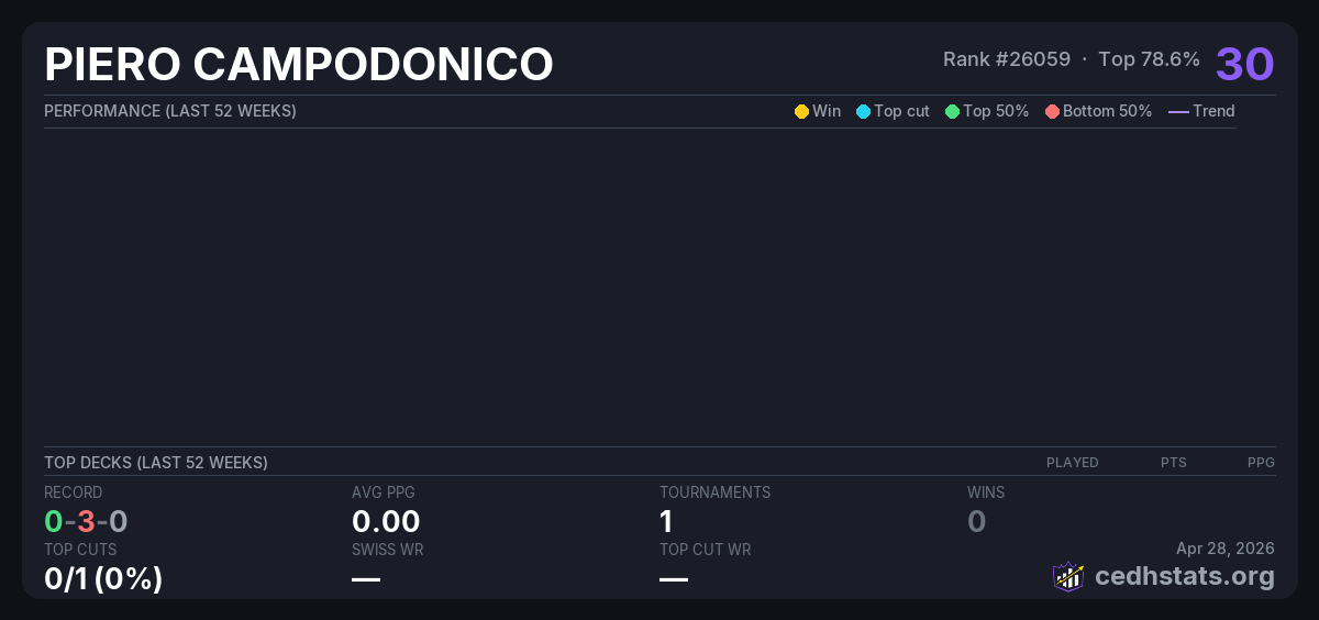 | CEDH PACTO HAMMER Oct 04, 2025 · 20 players | Invalid pairing | 14/20 | 0-3-0 | 0.00 | 29 |