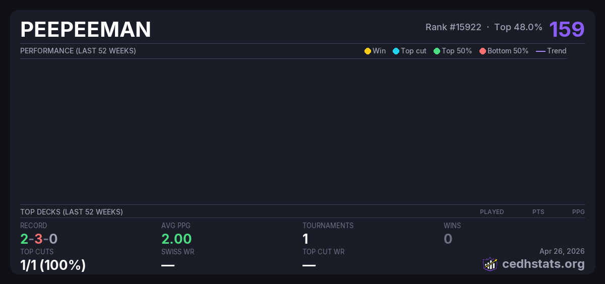 | VOID CHRIS May 30, 2025 · 16 players | Invalid pairing | 4/16 | 2-3-0 | 2.00 | 159 |