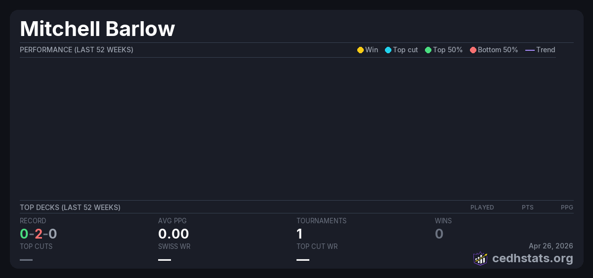| Commander Wednesday Weekly Dec 10, 2025 · 20 players | 16/20 | 0-2-0 | 0.00 | — |