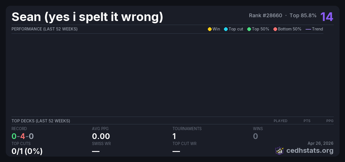 | Mono-color B3 Feb 22, 2026 · 17 players | 14/17 | 0-4-0 | 0.00 | 14 |