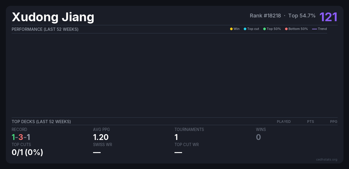 | 2025.10.25 广州CF cEDH Oct 25, 2025 · 80 players | Invalid pairing | 36/80 | 1-3-1 | 1.20 | 121 |