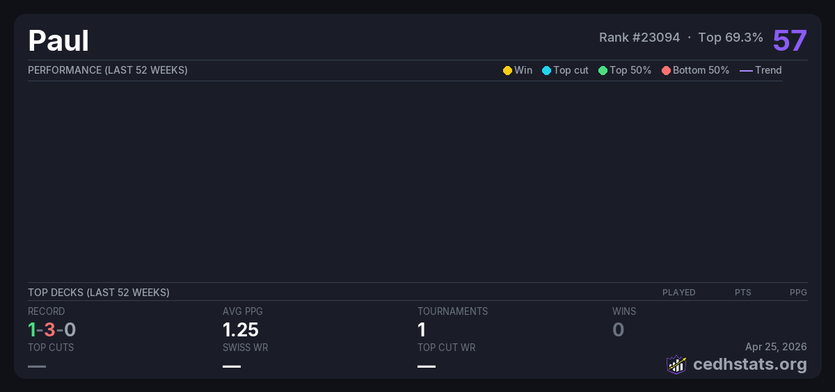 | Tournament | Deck | Result | Record | PPG | Points ? |