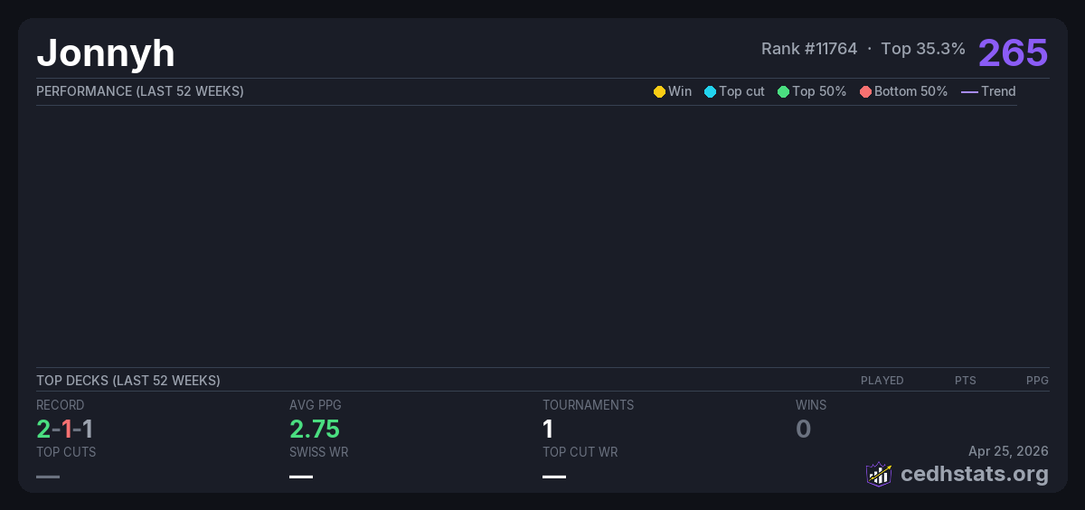 | SaltyCards Februar B3 Jan 31, 2026 · 30 players | — | 3/30 | 2-1-1 | 2.75 | 265 |