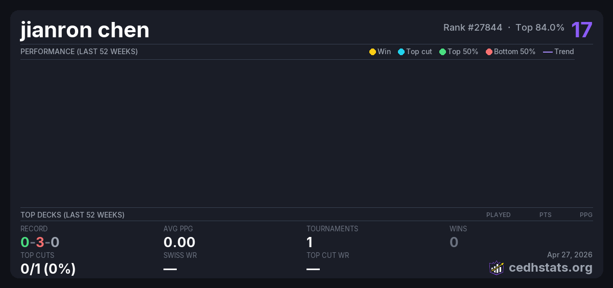 | 6月22日CEDH月赛 Jun 22, 2025 | Invalid pairing | 22/28 | 0-3-0 | 17 |