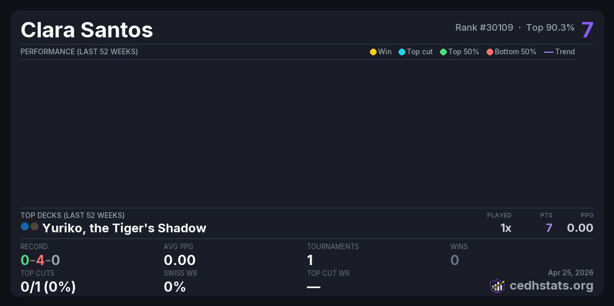 | Team 6750: 2nd Quarter CEDH Tournament Apr 25, 2026 · 49 players | Yuriko, the Tiger's Shadow | 44/49 | 0-4-0 | 0.00 | 7 |