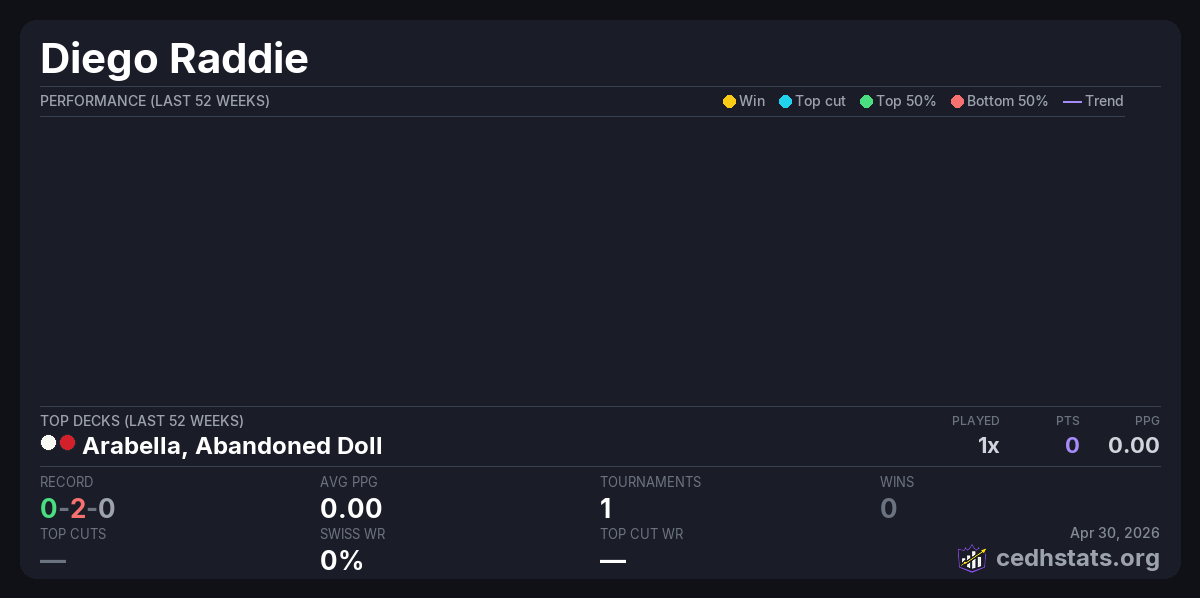 | MTG: Commander Budget (Bracket 2) Apr 30, 2026 · 18 players | Arabella, Abandoned Doll | 13/18 | 0-2-0 | 0.00 | — |