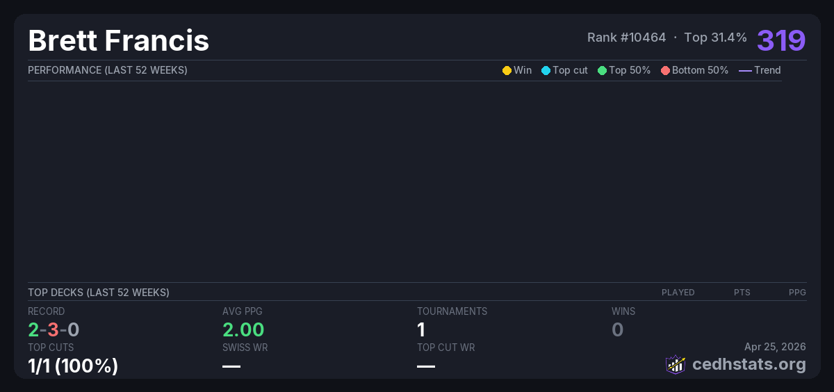| April EDH Tourn Apr 27, 2025 | Invalid pairing | 5/32 | 2-3-0 | 319 |