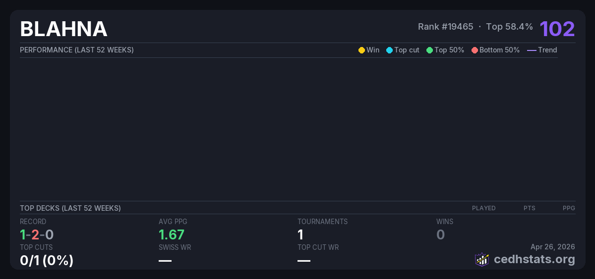 | Tournament | Deck | Result | Record | PPG | Points ? |