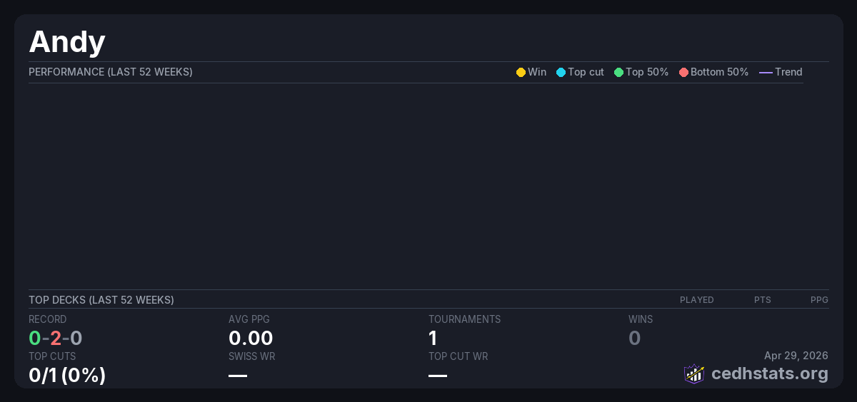 | Tournament | Deck | Result | Record | PPG | Points ? |