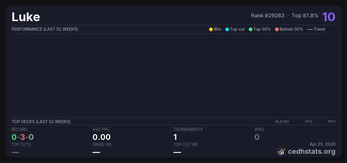 | Unaltered Precon Oct 12, 2025 · 26 players | Invalid pairing | 22/26 | 0-3-0 | 0.00 | 10 |