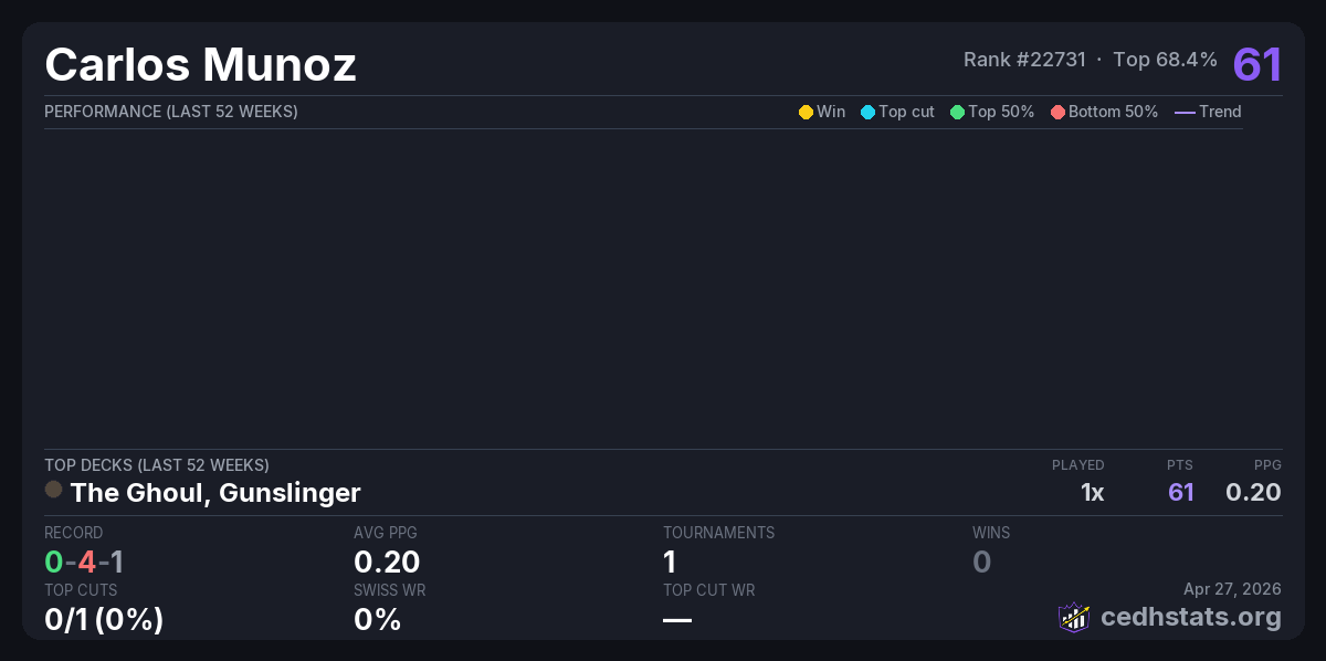| Atlantic City TCG Show cEDH $1.5K Apr 25, 2026 · 61 players | The Ghoul, Gunslinger | 46/61 | 0-4-1 | 0.20 | 61 |